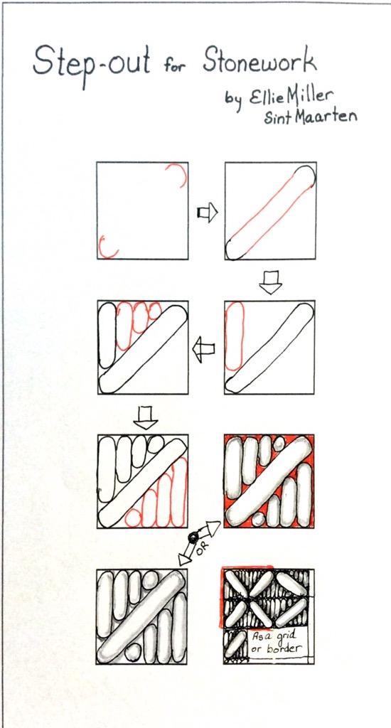 Before creating the step-out and naming the pattern, I checked through all the patterns in TanglePatterns.com’s latest e-book catalog (2017) called Presenting … The Tangles. To the best of my ability to discriminate, this tangle is unique. Two or three patterns might be roughly similar, but none share more than one characteristic with Stonework. One pattern has stacked oblongs, but they are all the same size. Another pattern has a diagonal oblong, but no vertical or horizontal ones. That’s as close as other patterns came to this one.