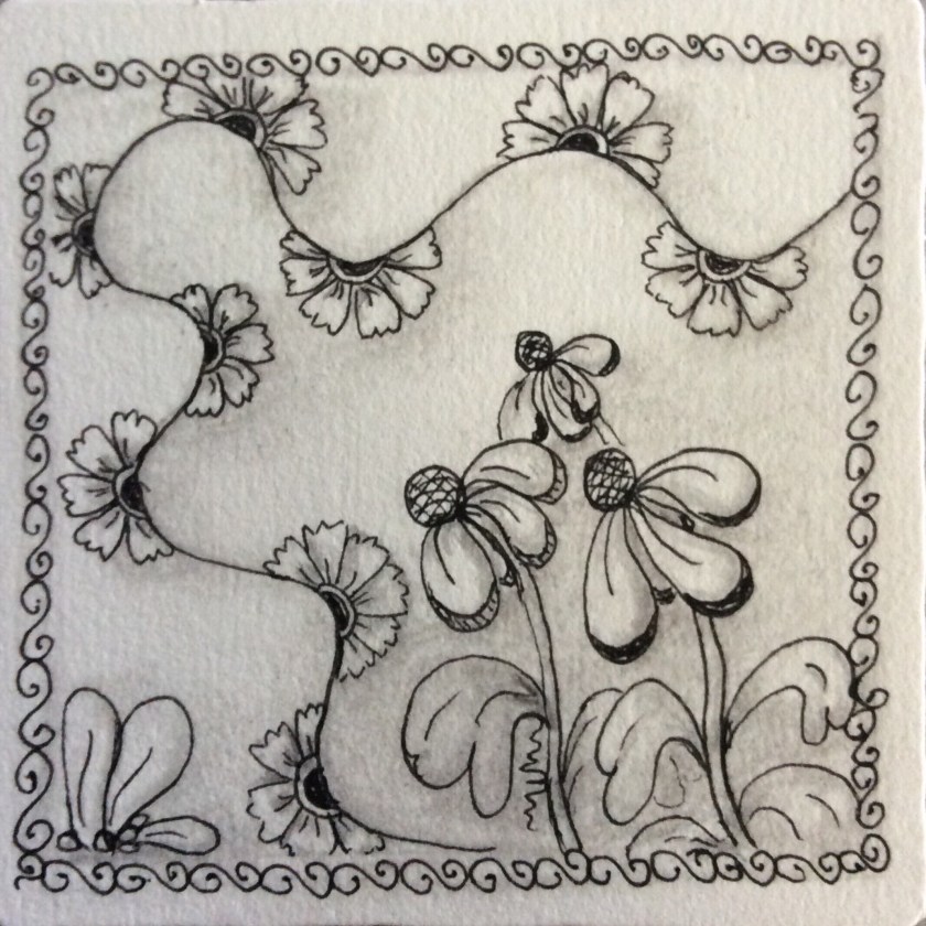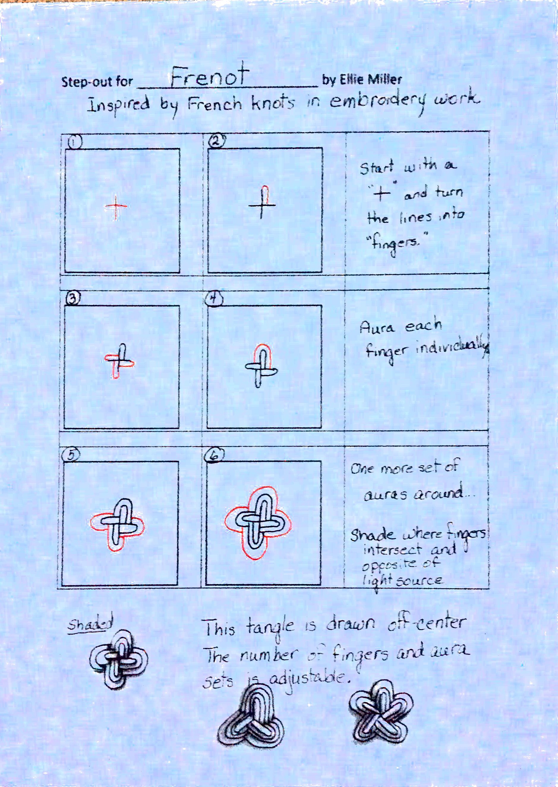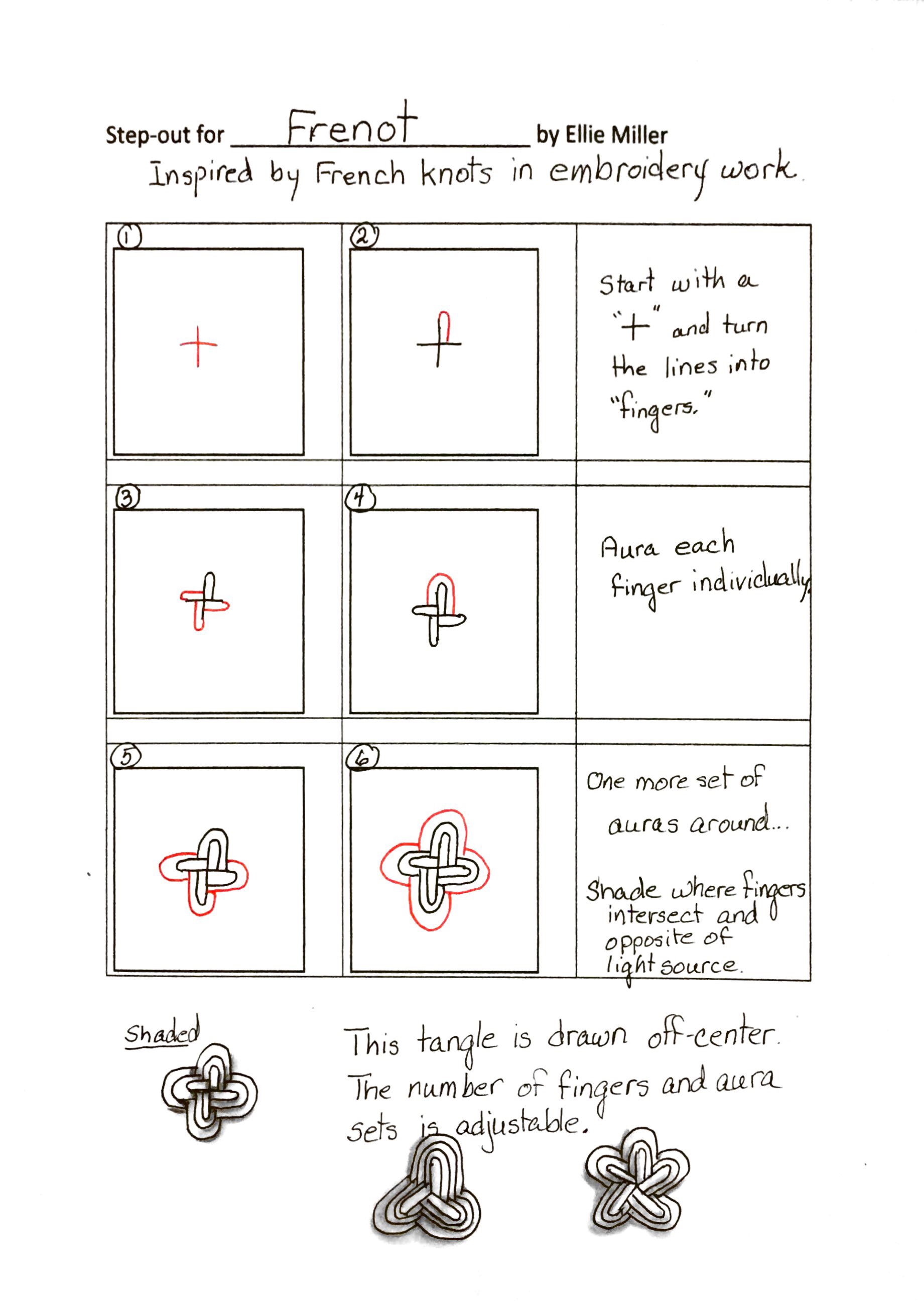 Frenot  was inspired by the French knot in embroidery work. While unpacking from our move last year, I came across a tiny piece I started years and years ago but never finished. One stitch that was used in it was the French knot. There was a cluster of French knots, creating a ring of petals or blooms. It inspired me to create a tangled interpretation. Being completely new to Zentangle, I didn’t know that anyone can create and name a tangle. Although I used it in some of my tiles, I was afraid to share those tiles because they contained an “unknown” pattern.  It took a while to realize that 1) anyone can create a new pattern; and 2) it is unique, as far as I can tell.