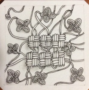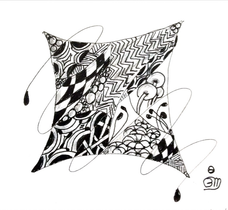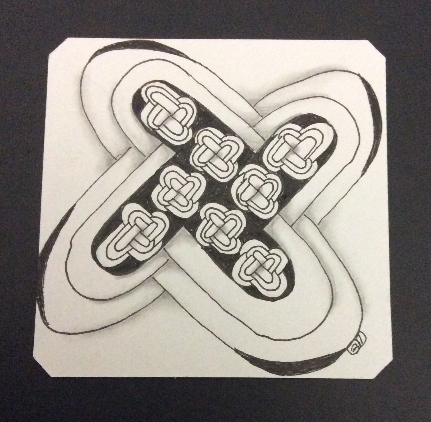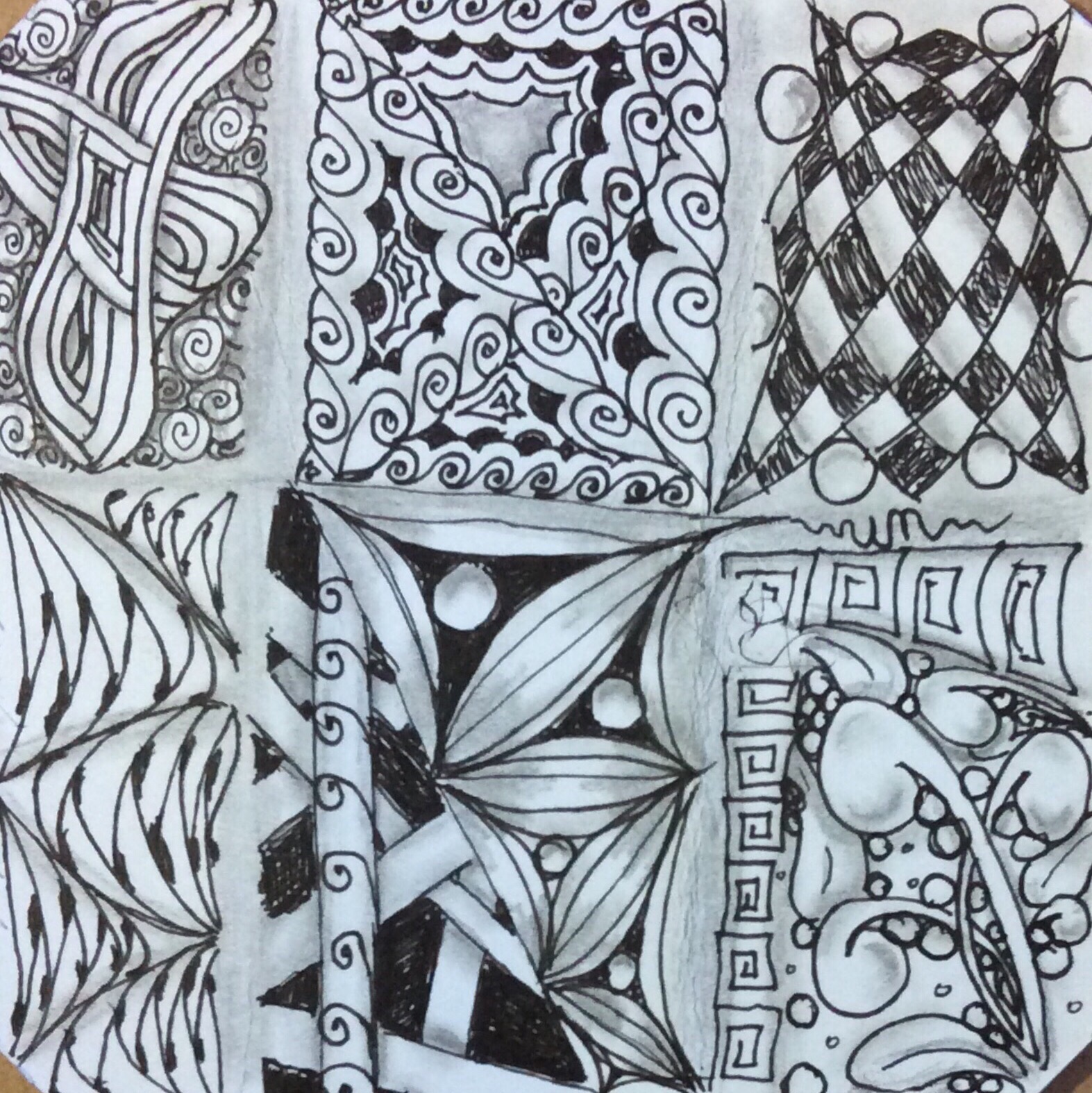 One of my first tangles, late April, 2016. I thought this was so cool! I knew only 9 patterns then, and I included them all!