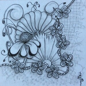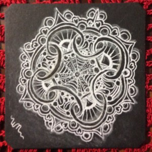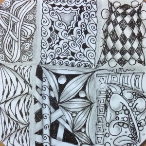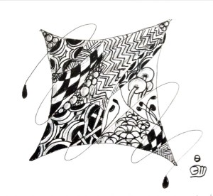 Nothing fancy, and I admit I shaded it at home because he came out faster than I expected–but still not a bad little piece of on-the-go tangling. It was a little cramped behind the wheel, as I am very short, but I had enough elbow room to draw and relax a bit ( and I could have moved the seat back). My husband always calls for pick-up too early. Rather than be angry, I tangle while I wait and let the endorphins flow. And if I am not finished when I reach the cashier or my breakfast order arrives (or my husband gets in the car) I can set the tile aside to complete it another time. I don’t need to worry about forgetting what the next step was supposed to be because Zentangles are unplanned. The patterns should be those that come to me when the pen reaches a blank space. When that space is reached–in the next microsecond, a year, or any time in between–the pattern that comes to mind is the one that goes there. It’s OK to plan the patterns; it’s just not necessary.