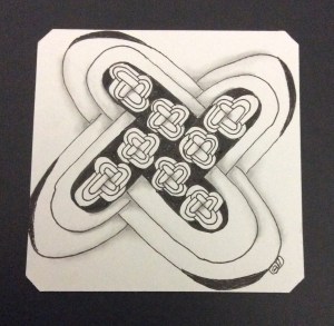 When I draw challenges or challenge-like tangles, I like to keep things very simple. If I don’t, i keep adding elements until the pattern looks cluttered. Maybe that’s a reflection of what is going on internally, but I don’t always like the effect of dumping my clutter onto a tile. So I minimize. The benefits of meditation are still there, as I still need to focus and concentrate to keep lines straight and relatively even distances. But I stop long before I might if tangling completely from my own mind with no suggestions from outside.