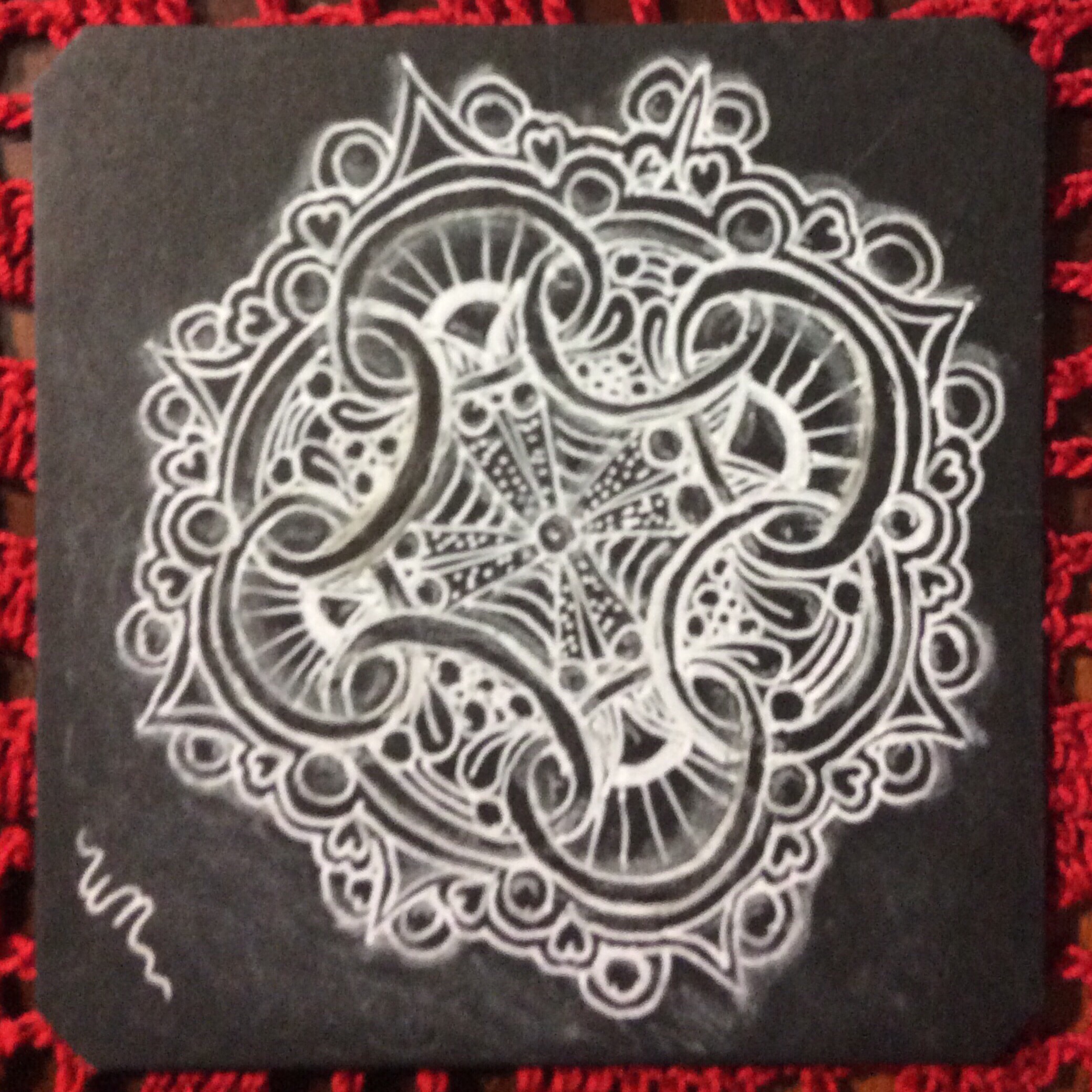 Encouragement from members of Mosaic got me participating in national and international challenges on Facebook and blog sites. The challenges are not as supportive as Mosaic, but I have learned to judge tangles on “Zentangleness” instead of eye candy. Many challenge submissions are Zentangle Inspired Art, which can be beautiful and whimsical, but a lot are by professional artists. They each have something to teach, though, even if the intention is not there. There are many artsy and craft ideas presented by challenge participants. Mindful tangling is difficult to put out there when one is not an artist. My tangling may not compete in artistry, but it solidly represents the Zentangle method and purpose. After one or two posts, I was no longer intimidated by the pros. For an example of a short (two-week) challenge, visit “valentangle2017” on Facebook. It came with a book of instructions for what to include in each day’s tile, along with lovely examples to use as models. The contributor pool was just over 200 participants–small by Facebook standards. Lots of beautiful work on display, though.
