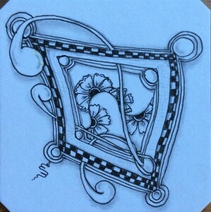 The tile here was part of a sort of challenge on the Zentangle Mosaic app by the founders of Zentangle. The idea is that we all run into stumbling blocks occasionally regarding what to tangle. The suggestion was to draw a frame that is far from the edges. Next step, aura it–outline it bigger on the outside. Next, draw a Mooka pattern–or a Zinger or other “long-stemmed” pattern starting at an interior corner and moving behind the frame so its “head” rests on top. Then embellish. Just a few simple steps to start the creative juices flowing. Before you know it, you have a completed tangle!