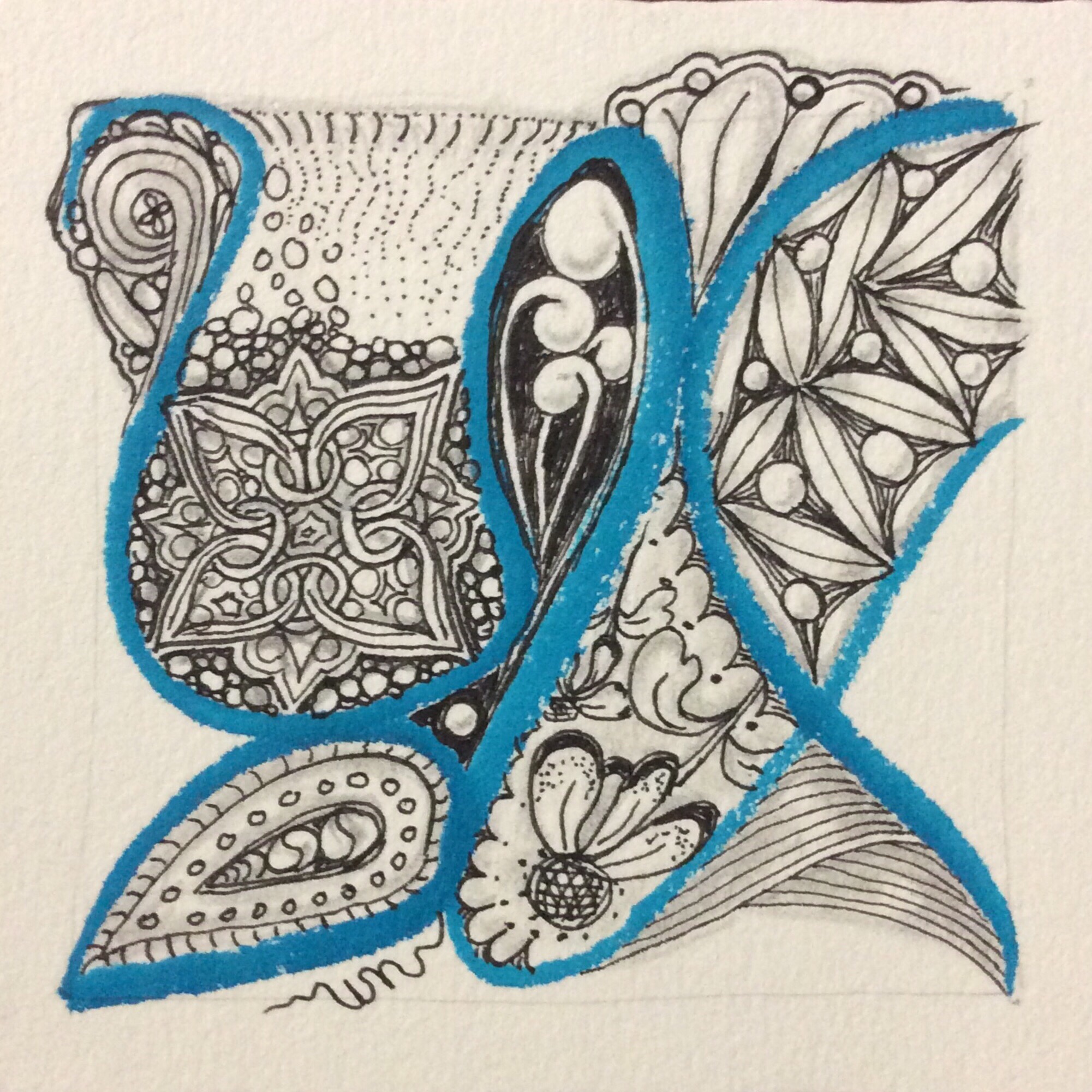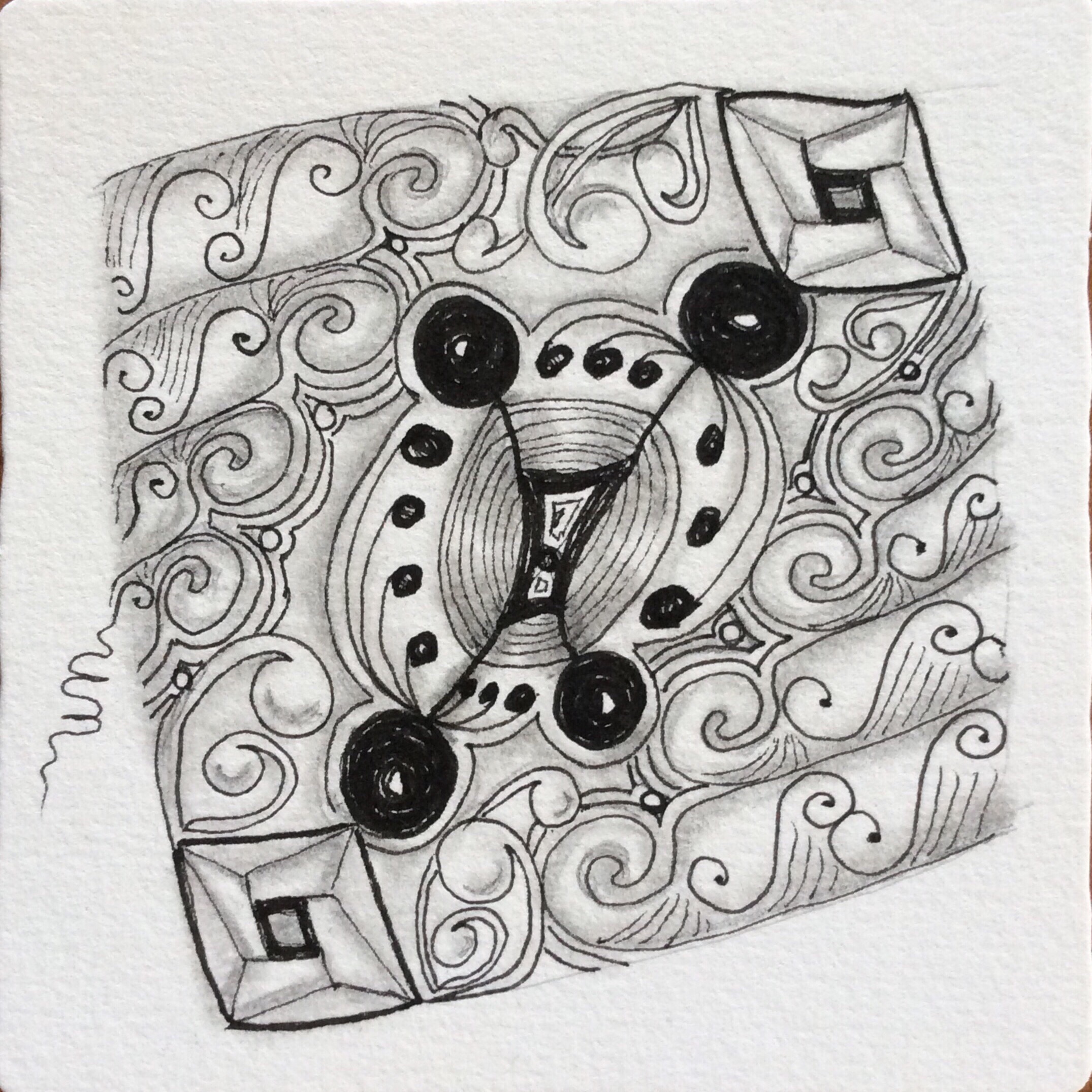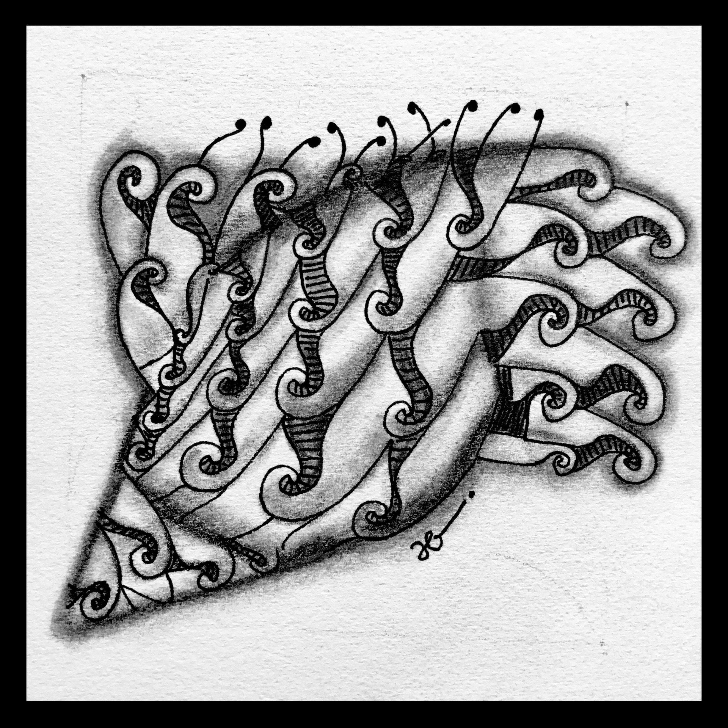 The very simplicity of the way I tangled through the first six lessons helped me touch base with the reasons I started tangling to begin with–to relax and re-center my mind, to let go for a few moments of the demands of the world around me, to remind myself that I can still learn new things and create. And so I kept things simple–nothing fancy or extravagant; just the original tangles presented in the Primer, without embellishment except as the exercises required.