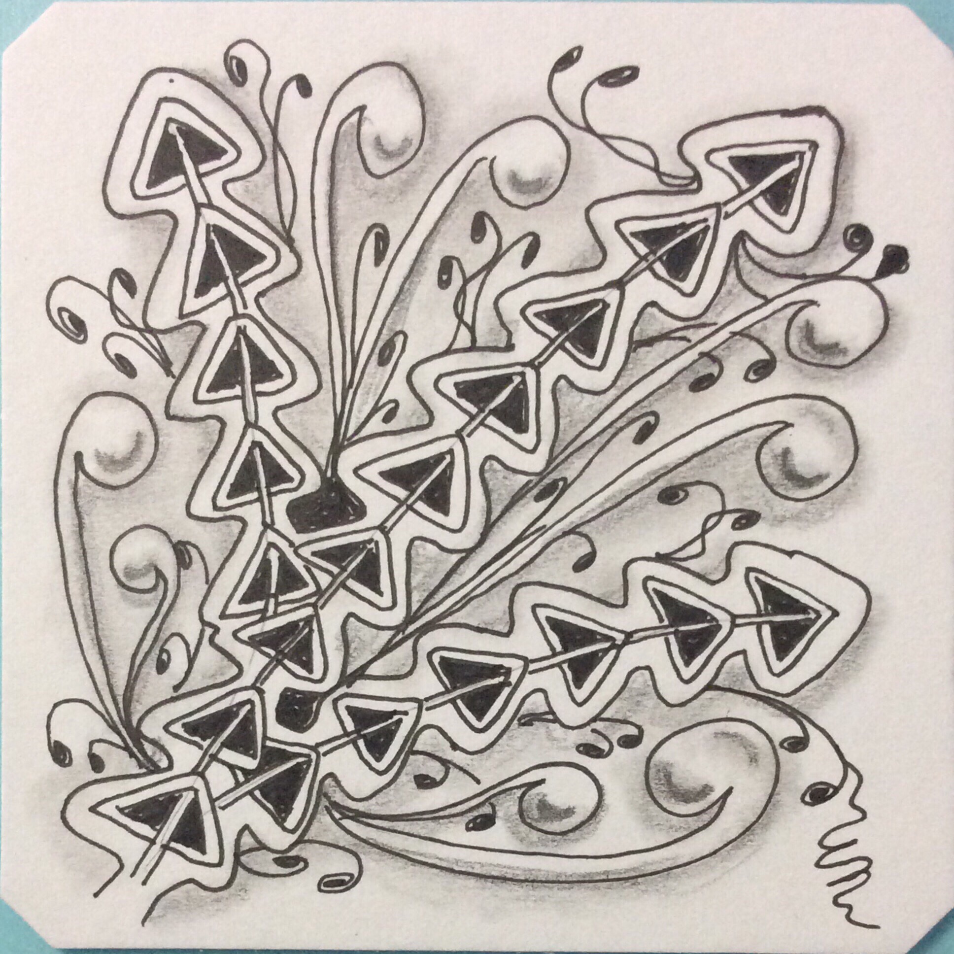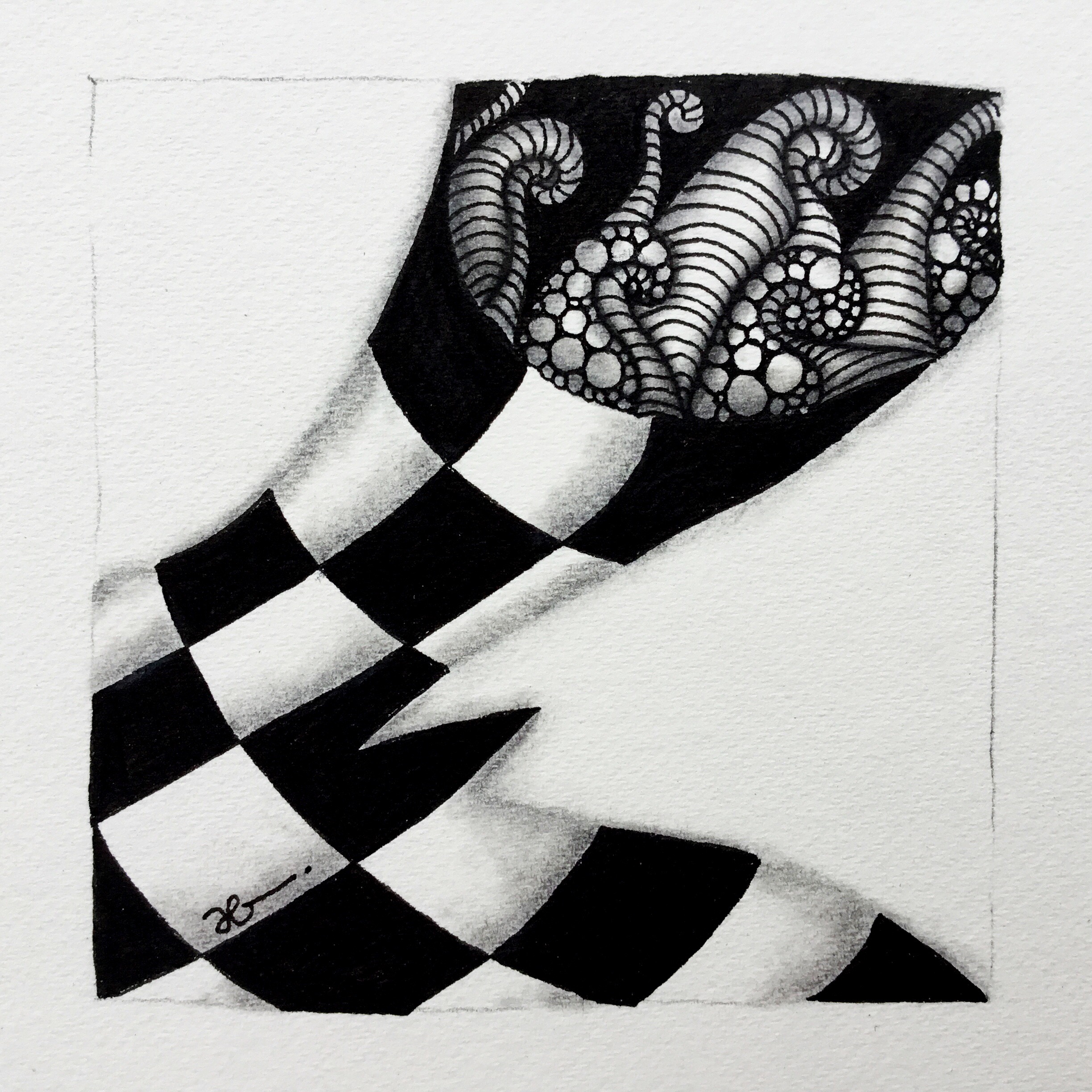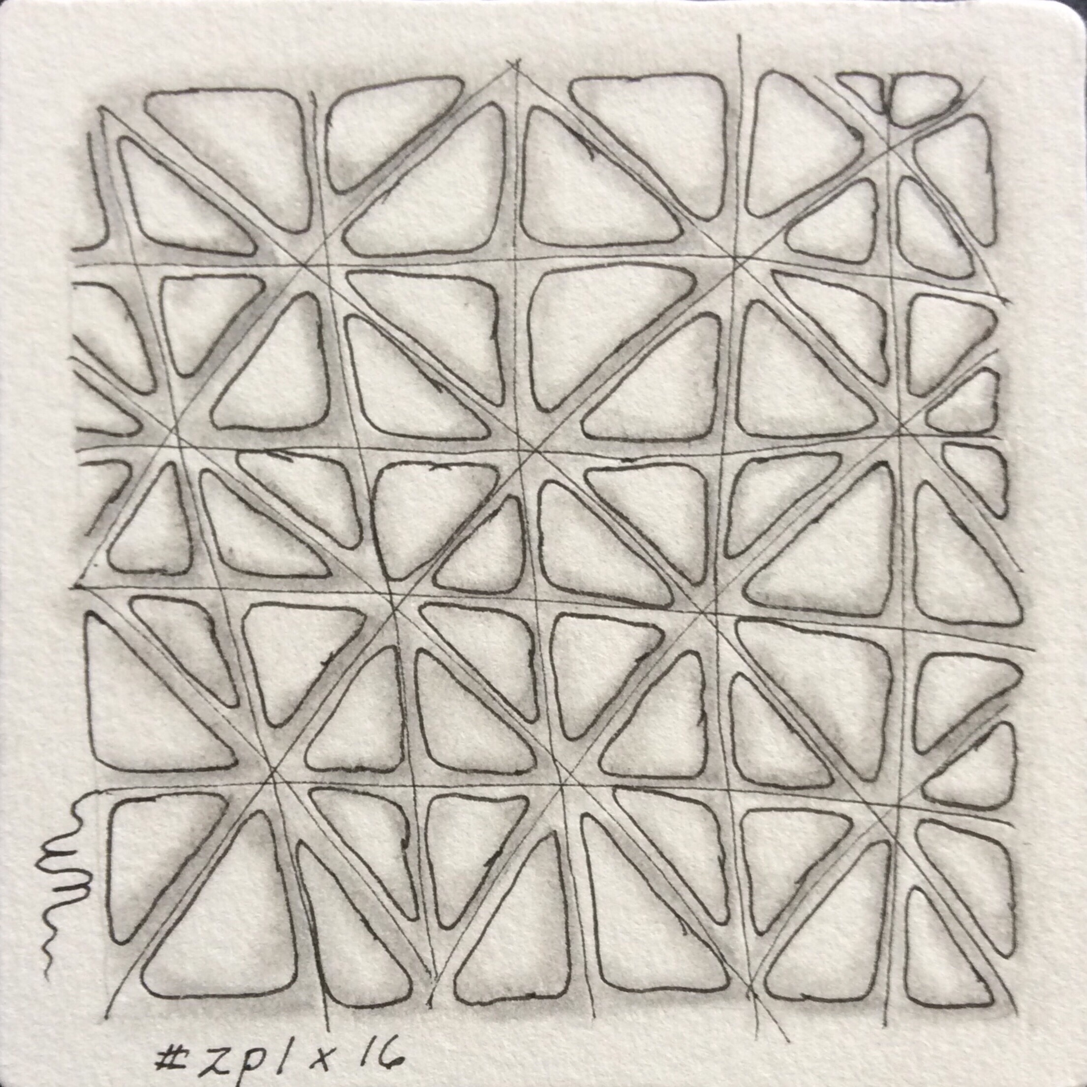 Each time I work through these first chapters I try to vary the patterns I use, especially for the string and shading exercises in Chapters 4 and 5. Applying the exercises and techniques to newer or simply different patterns enhances the way I draw and use the patterns. This emboldens me to try new things with strings and with patterns new to me. Therefore, each pass through Primer provides not only new ideas for tangling, but serves as a reminder of classic drawing techniques and patterns and techniques that I forgot about as I picked up and used more and more patterns and as I developed my own style. This time through, I limited my tangling to only these first 23 patterns, concentrating on the first seven.
