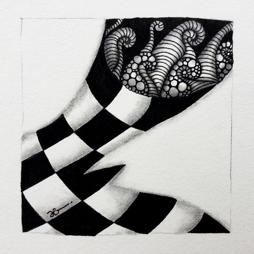 Only seven of the basic twenty-one tangles introduced in the first six chapters were used to create these four tangled tiles. One tangle–the checkerboard-like Knights Bridge–is used so often that I forgot that it wasn’t introduced in the Primer at all! It was introduced very early in One Zentangle a Day, by Beckah Krahula, the book that introduced me to Zentangle. (Incidentally, Ms. Krahula’s book was published in 2012–four years before the Zentangle Primer, Vol. 1 came out.)