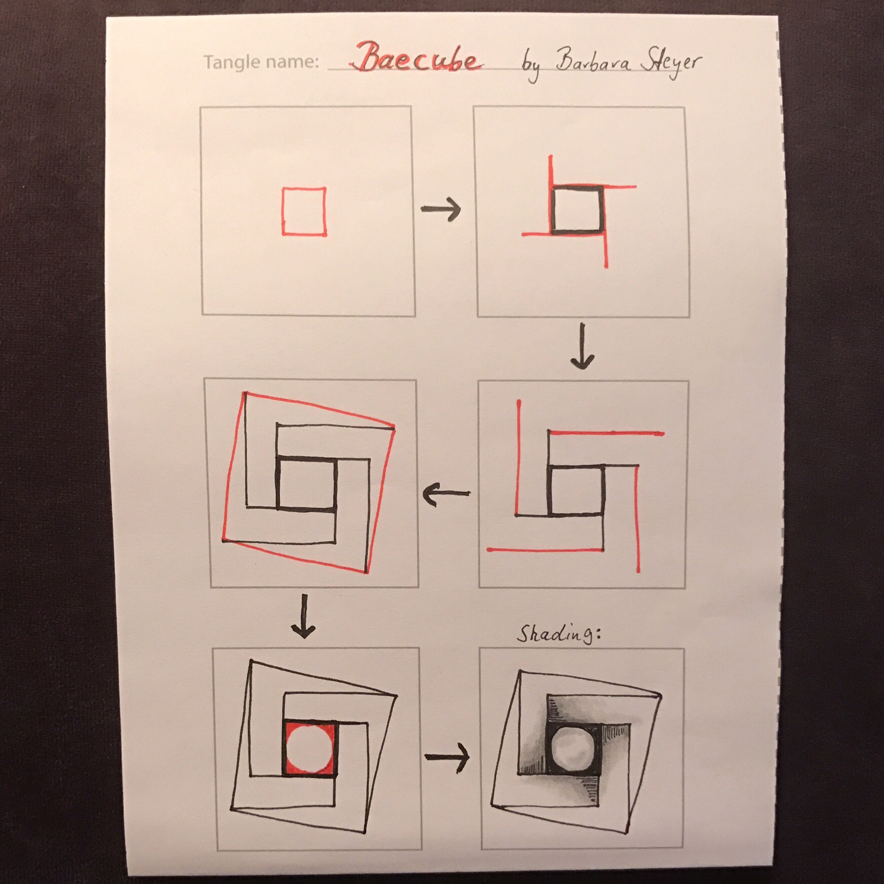 For those of us who enjoy drawing geometric patterns, German tangler Barbara Steyer has created a wonderful design! She calls it Baecube. I love Baecube because it creates a wonderful 3-dimensional weave effect.