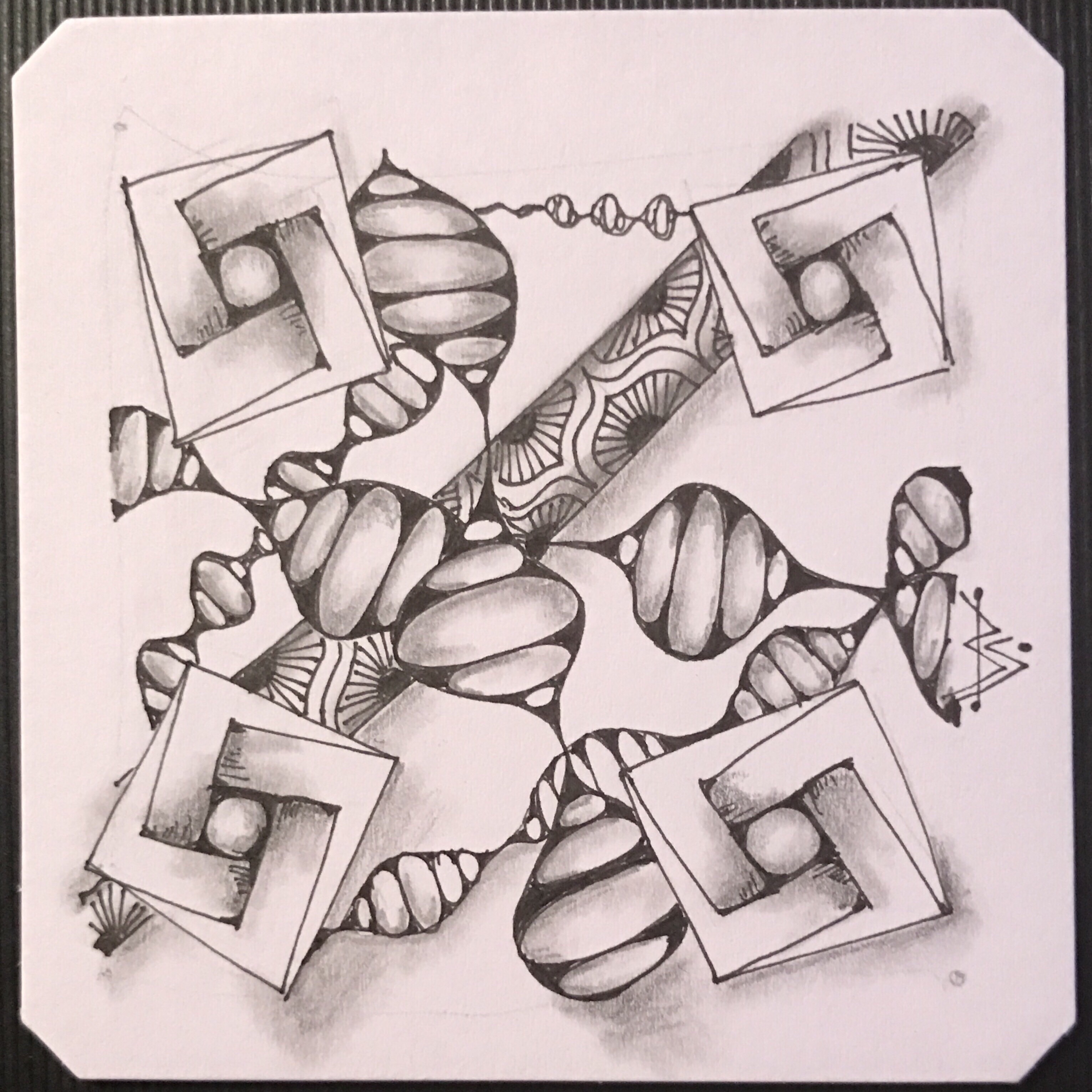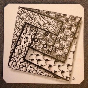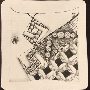 In her Zendala, Barbara enhances her tile with a pattern called Strutz and created by Sarah Fowler. Strutz will be featured in the next blog post. However, I wanted to include some tiles using Baecube that Sarah tangled.