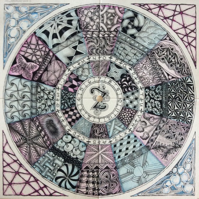 Another use for the spinner is for on-the-spot tangling suggestions during an advanced class. It can be a fun way of selecting patterns to learn, if a tangle has not been used before; or just playing with sets or individual types of patterns. For example, the spinner can be used to select a border to use during tangling. It may be a pattern that would not come to mind on its own. After all, there are over 50 tangle patterns on the wheel.