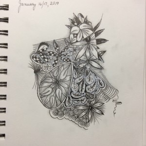 Today a new technique came to my mind for focusing on specific elements of a rather cluttered looking tangle. The process occurred to me as I was tangling a piece that started out as a good idea, but then became “muddied”. What I mean by that is that suddenly I could not easily discriminate one type of “leaf” from another. I was taught two ways of making elements stand out–1) thicken the outline or heavily shade the form, or 2) aura the form to make it stand out. Well, in the middle of a muddle, adding an aura is almost impossible. And if the forms are intended to have equal ‘weight’ in the design, heavily shading one causes the one next to it to melt into the background. Neither was what I wanted, and it was too late to aura. So what to do?