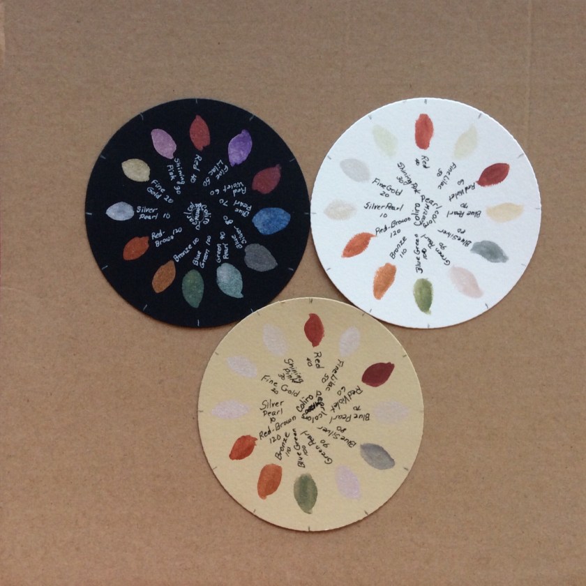 In this photo, taken in natural daylight, all the colors were applied to the tiles in exactly the same order. Yet, the best representation of the colors is on the black tile. If these were a clock, you can see the lilac color on the black tile at 1:00; on the other tiles, that color looks silver (on tan) or pale tan/warm gray (on white). The differences are a bit different “in person,” but not by much.
