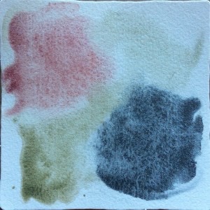 Today is also a rare one for me: a day in which Tangling inspiration did not come. So I took out some new watercolors and started by making swatches on the three official colors of Zentangle tiles to see how they differ depending on background color. Most watercolors tend to have a bit of transparency to favor light. That is, they let some of the color of the paper through. The colors I used here are opaque–no paper color shows through. Yet, the colors surrounding the swatches make the paint colors look different. A small part of the reason is the pearl essence of these paints. The other, greater reason deals with how our eyes perceive color, and I am not qualified to get into that explanation.