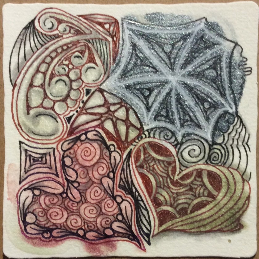 Next decision: tangle over the colors, or tangle a “broken” pattern around the colors? Well, there was very little white left on the tile, so that left tangling over the color areas, using a white gel pen over the blue silver because I suspected black ink would be invisible. Maybe brown ink would work over the blue green area.