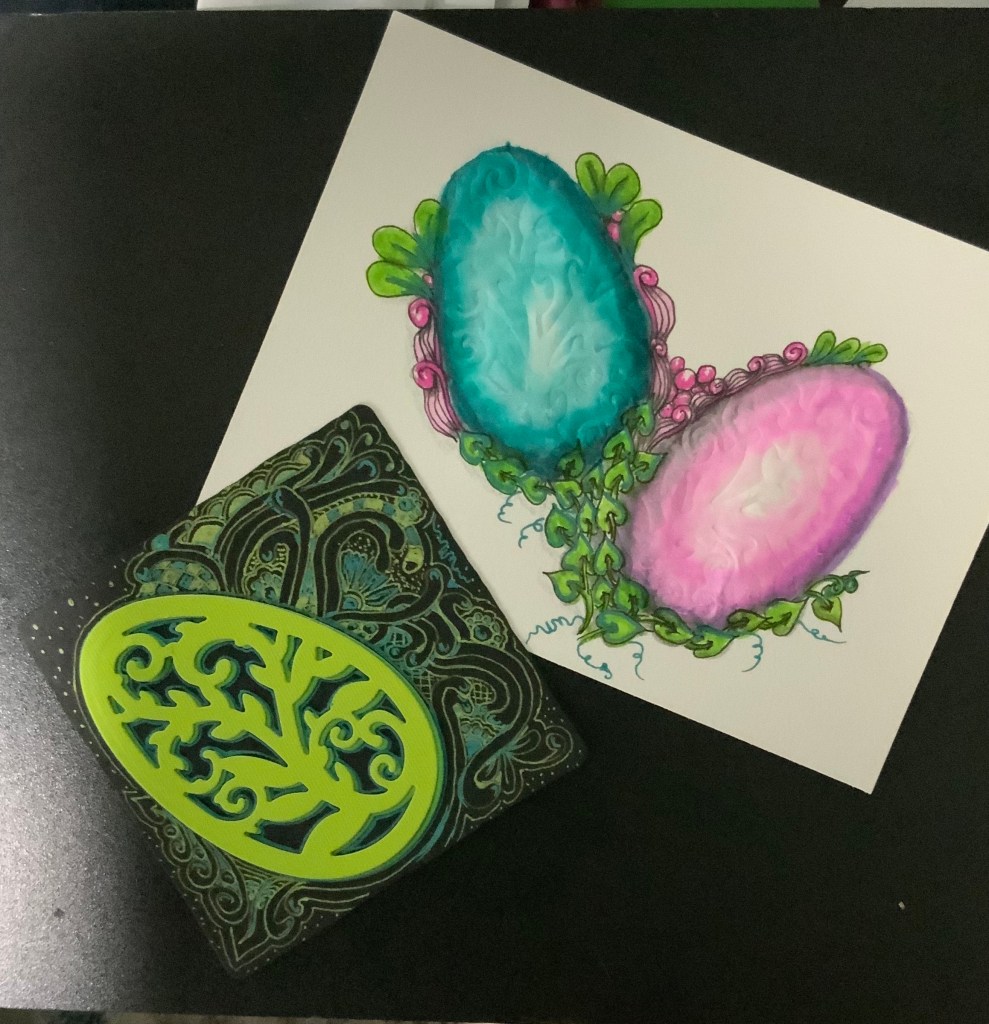 Once the color dried, I used organic Zentangle patterns that coordinated with the Zentangle-like patterns of the egg to surround the eggs. This not only showcased the eggs, but also surrounded them in a sort of nest of tangled foliage.