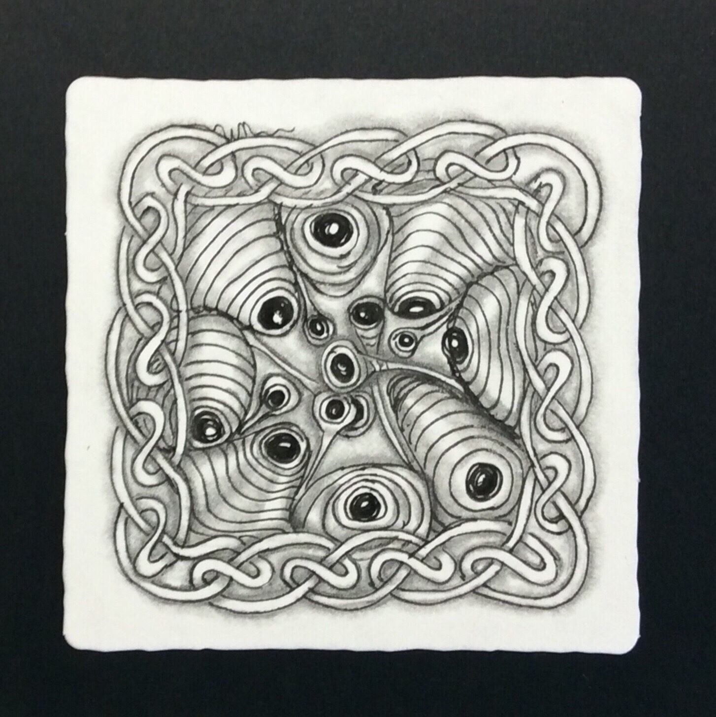 The tangle Rumpus doesn’t end here. As presented in the official step-out for this pattern, it is filled with pearl-like orbs, then richly shaded. If you have the Zentangle Mosaic app on your mobile device, you can see the official step-outs for both Rumpus and Arukas there. If not, here is a Pinterest link for Rumpus that will help: https://pin.it/bz2wa5n6mj5icx ; and one for Arukas: https://pin.it/y6ikp7r6mrlp62 .
