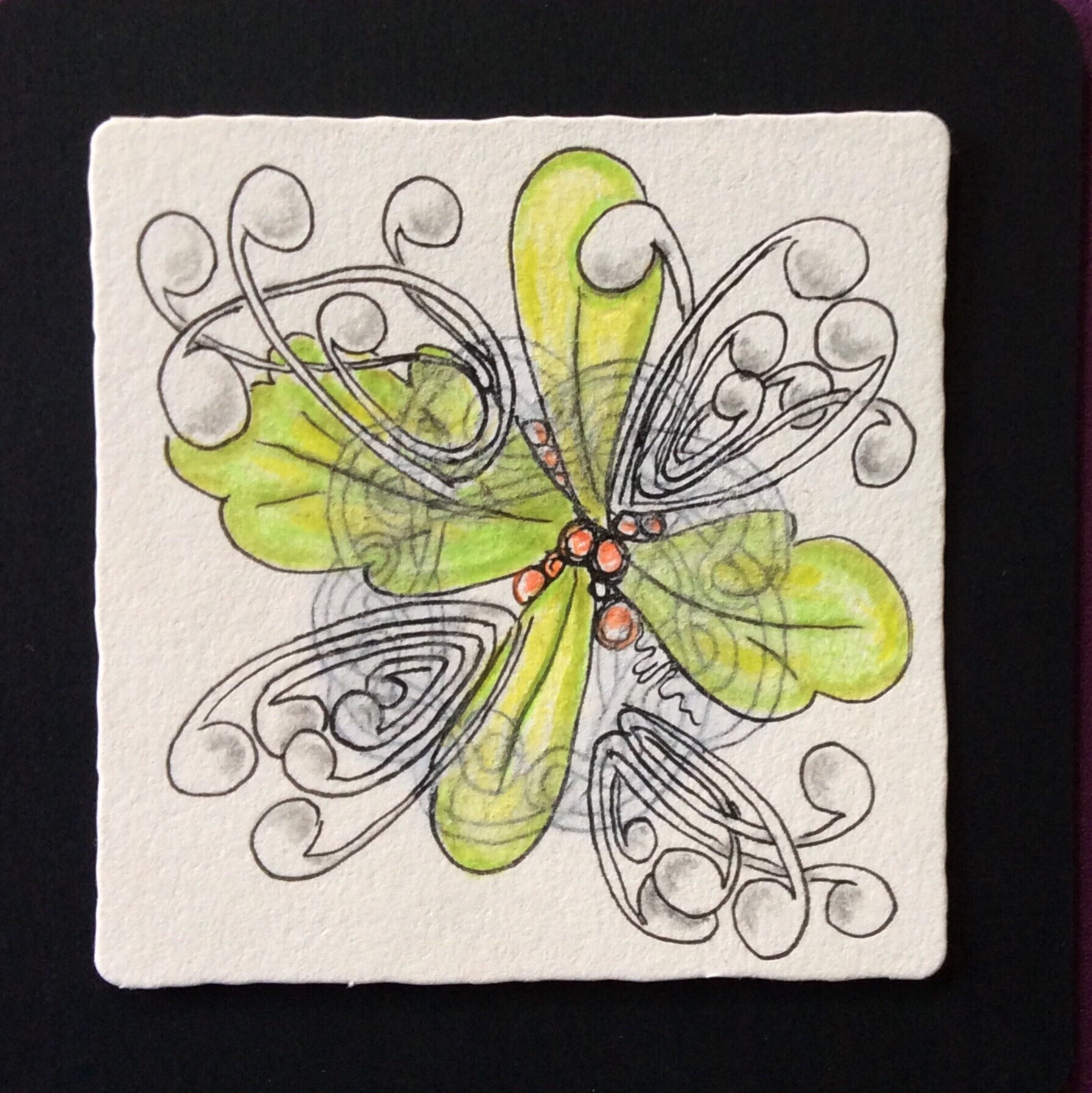 While our island was locked down from late March pretty much to June, a small group in my Cupecoy community began tangling beside the pool … under a canopy, wearing our masks, and spread out enough to keep ourselves and each other safe from the contagion of the Covid19 pandemic. Some beautiful art has come from the sessions and personal tangling. Each tangle has her own style, each beautiful. Here is one, tangled by Ruby as her interpretation of Fengle took off.