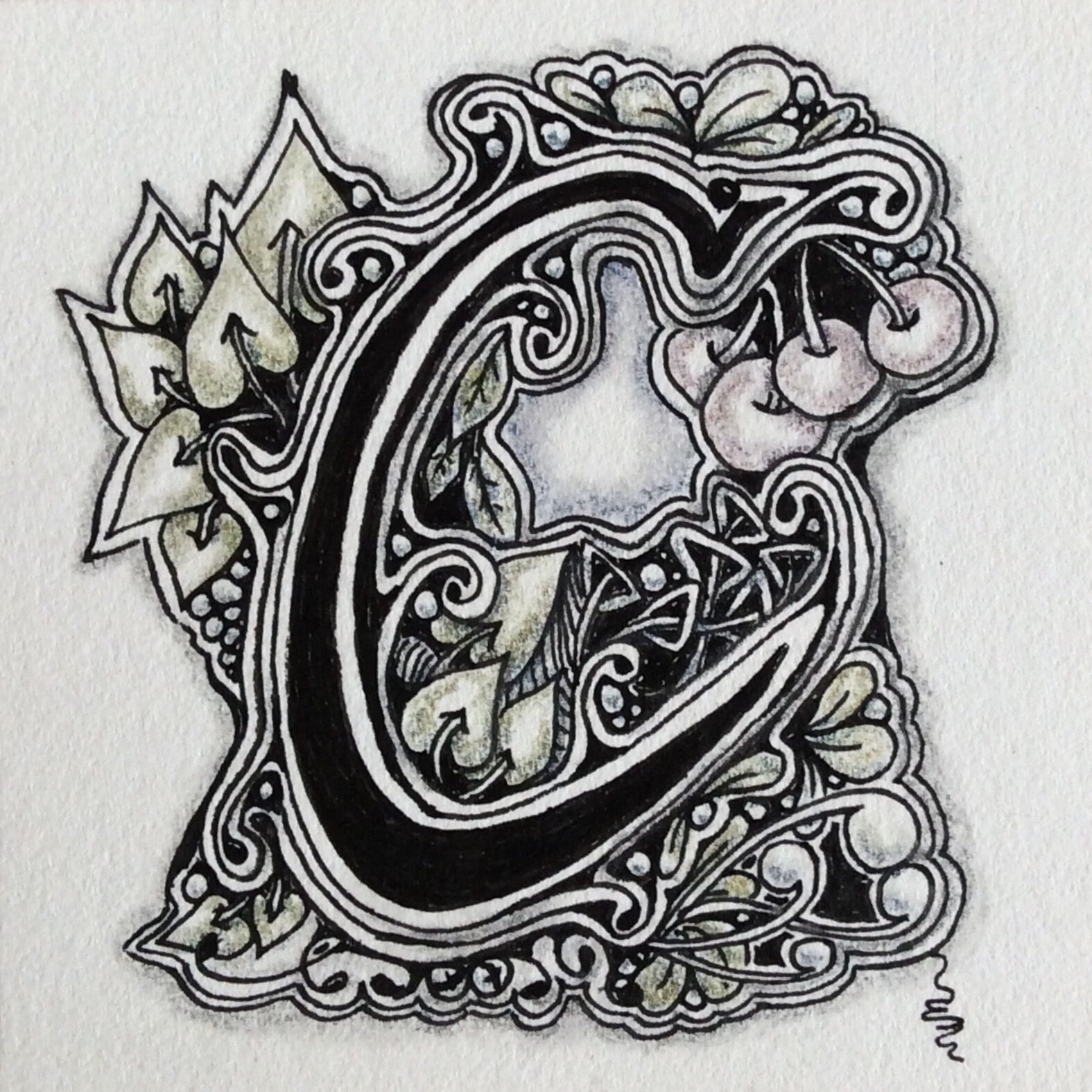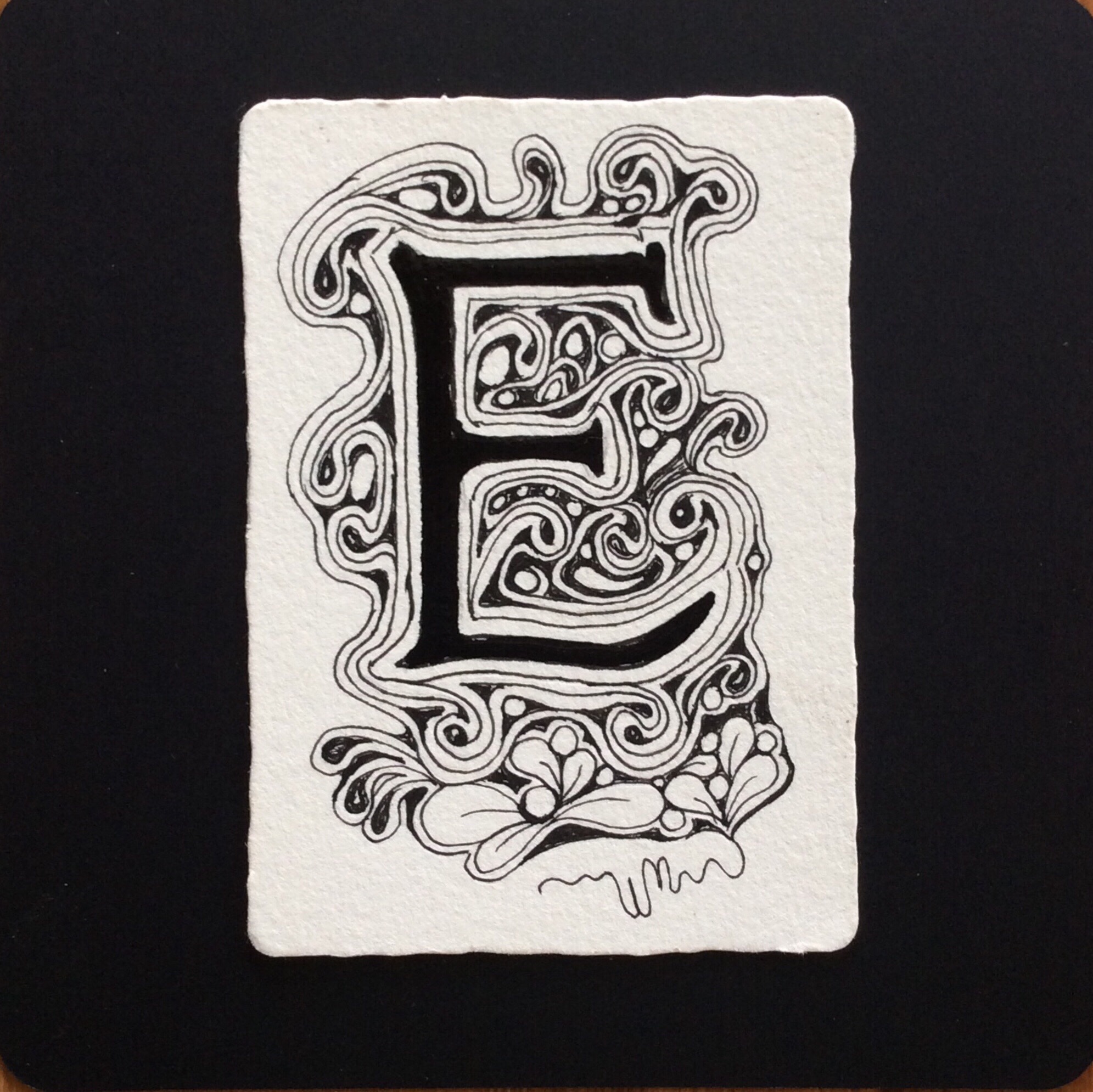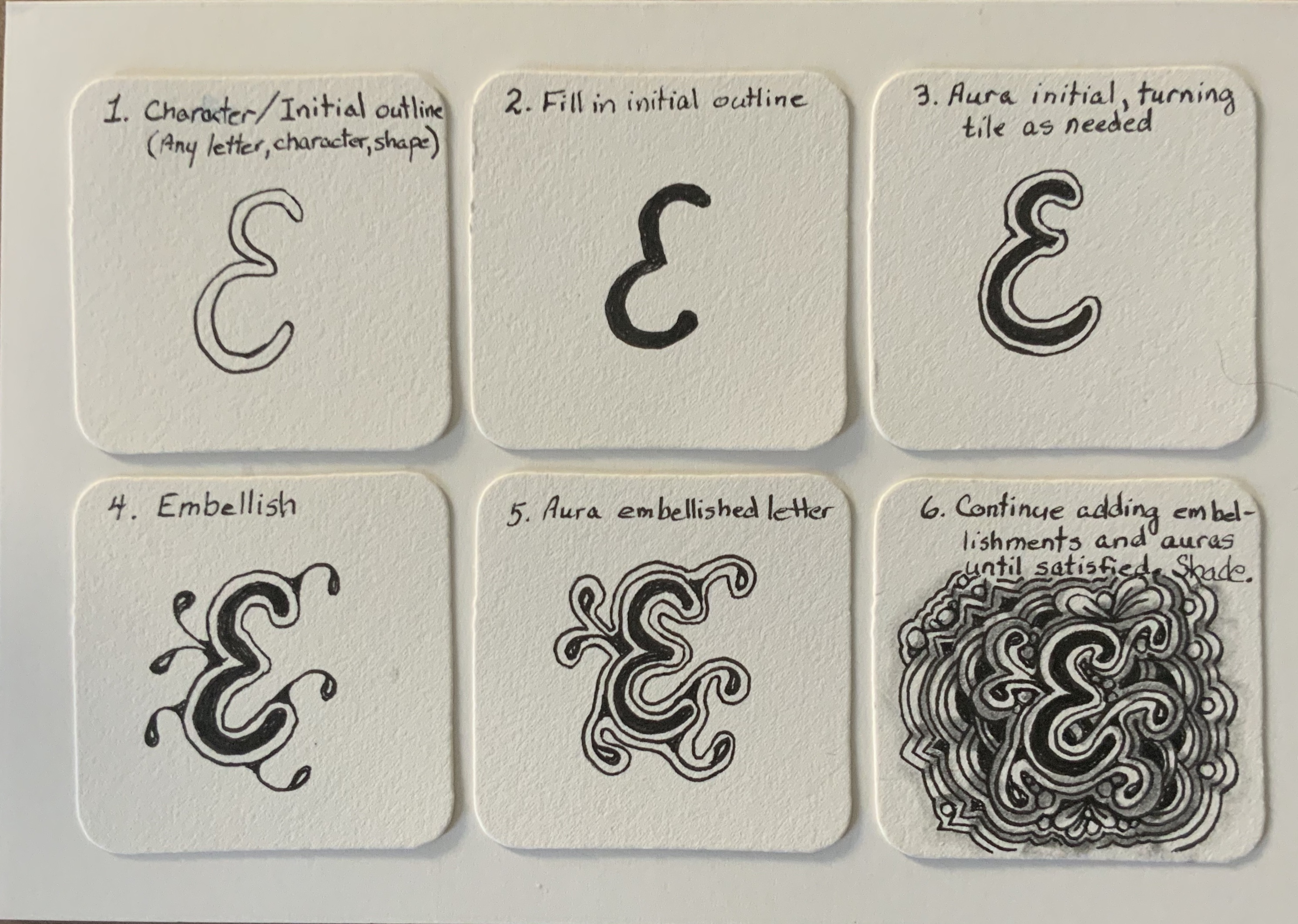 One of the loveliest projects to come out of Zentangle HQ is something called Embedded Letters, tagged #EmbeddedLetters. This project relies heavily on auras. Interestingly enough, even if the auras aren’t perfect, and even without shading, the result is lovely. Here are a few examples of my own embedded letters.