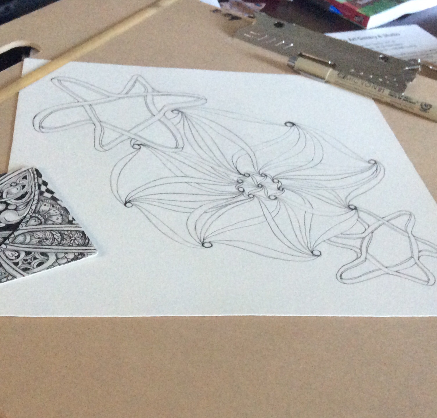 The starts of two high focus patterns, Rumpus in the center flanked by Arukas, are pictured above. These are difficult on a traditional 3.5 inch square tile (shown on the left for comparison), but become ultra high focus when done on a Zentangle Opus tile. The Opus tile measures three regular tiles across by three down, or 10.5 inches square. Sometimes, when enlarging a pattern in a sketchbook or on an Opus tile, the challenge is to keep in mind exactly where the pen is to end up, as the destination is often covered or obscured by the very hand that is doing the drawing.